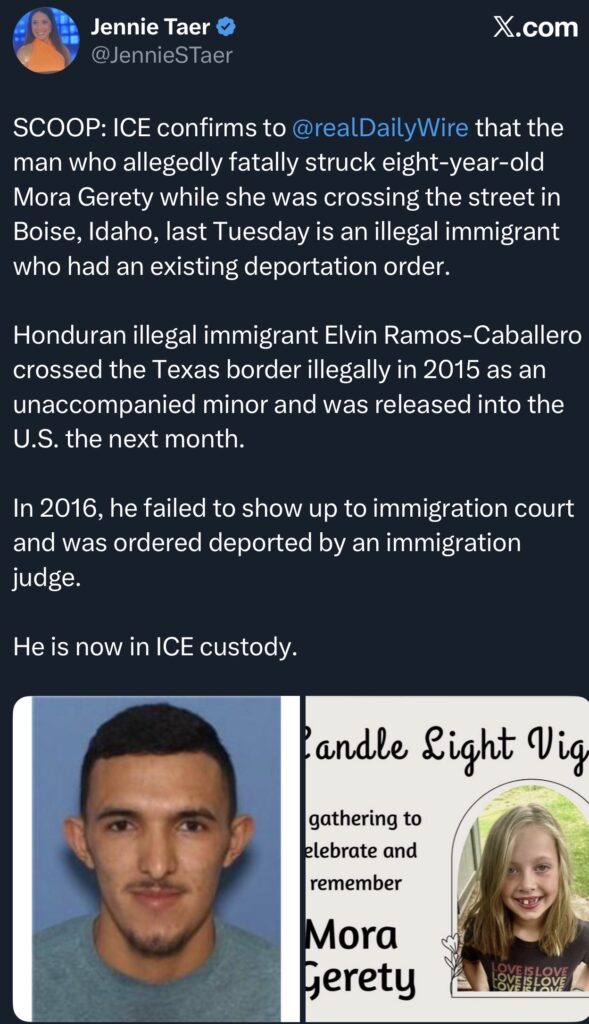Last week eight-year-old Mora Gerety was walking across a Boise street with her family when Elvin Ramos-Caballero, a Honduran illegal with a final removal order since 2016, allegedly struck her while impaired by alcohol. Mora died from her injuries. Ramos-Caballero is finally in ICE custody — nine years too late.