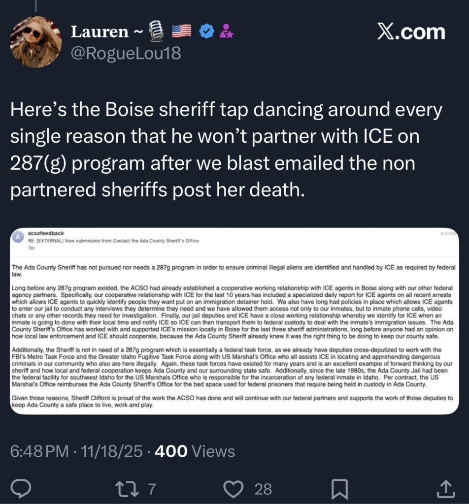 The Ada County Sheriff has yet to abide by the loosely enforced 287g Executive Order recently put out by Republican Governor Brad Little. This federal program deports illegals detained for other crimes and may have potentially helped prevent this situation and could prevent others for sure.